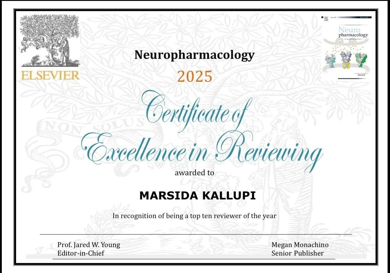 We are thrilled to announce that Dr. Marsida Kallupi has been selected to join the Editorial Board of the prestigious journal Neuropharmacology. In recognition of her exceptional service, she has also been named one of the Top 10 Reviewers for the journal.